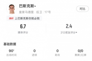 体育资讯3月2日讯 本轮西甲,贝蒂斯2-1战胜皇马。巴斯克斯本场数据: