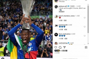 杰克逊社媒晒出头顶欧协联冠军奖杯的照片,并写道:“我想我们把它带回家了,不是吗?”