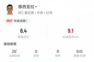 期间,穆西亚拉4次地面对抗成功2次,被犯规2次,赛后媒体评分6.4。