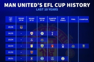 最近十年,曼联曾在16-17赛季以及22-23赛季获得该项赛事冠军,此前最差战绩是18-19赛季第三轮不敌德比郡,21-22赛季第三轮不敌西汉姆。