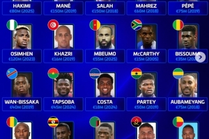以下为非洲各国历史身价最高球员具体身价情况: