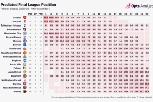 此外夺冠概率最高的是切尔西的2.6%。热刺1.1%,曼联为0%。