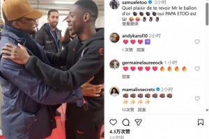 体育资讯10月22日讯 埃托奥在个人社媒晒出与巴黎球员登贝莱见面的视频,两人相拥致意,相谈甚欢。