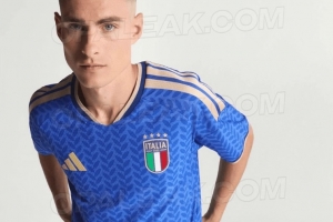 阿迪达斯标志性的加大版三条纹位于肩部,而阿迪达斯和意大利足协的徽章则采用金色,醒目地突出在蓝色底色上。