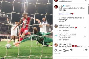体育资讯10月26日讯 瓦尔迪今天在Instagram发文,庆祝自己打入克雷莫内塞生涯首球。